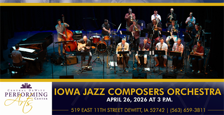 University of Northern Iowa Professor and award-winning jazz composer Mike Conrad brings Iowa’s premiere large jazz ensemble to DeWitt for a special performance at the Central DeWitt Performing Arts Center. This 17-piece all-star band has performed in Des Moines (Hoyt Sherman Place, Noce), Cedar Rapids (CSPS Hall, Jazz Under the Stars), Iowa City (James Theater, Coralville Center for the Performing Arts), Cedar Falls (Oster Regent Theatre, River Place Plaza), and Davenport (Redstone Room, LeClaire Park). Their "Fertile Soil Suite" (2021) earned Mike Conrad a SONIC Award from the International Society of Jazz Arrangers and Composers. The band plays music by Bob Washut, Chris Merz, Paul McKee, and other Iowa writers, showcasing the best jazz musicians that the state has to offer.